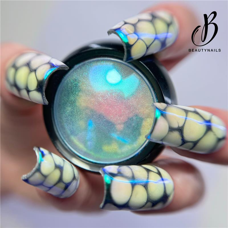 Le Moonlight Chrome est une poudre métallique colorée qui permet un effet aurora sur vos poses d’ongle. La couleur varie selon la base de couleur utilisée.