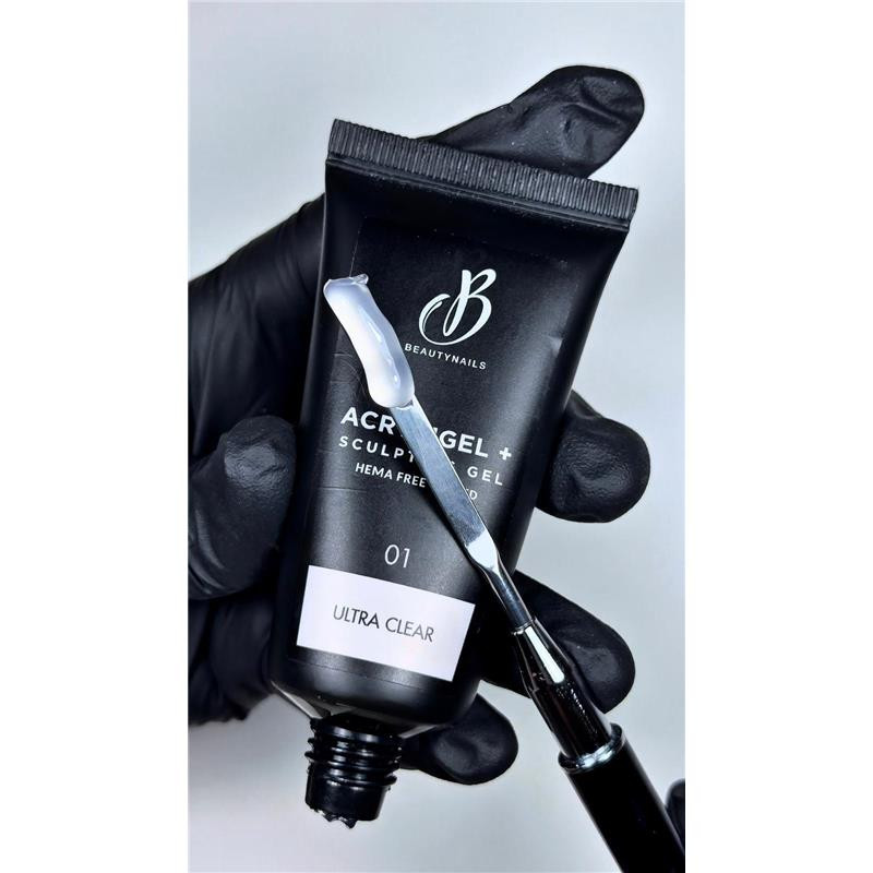Préparer l’ongle naturel (avec rallongement ou non). Appliquer le Nail Prep puis le Primer / Ultrabond. Appliquer le Rubber Base Clear (pour une adhérence optimale). Catalyser 60s sous Lampe UVLED. Prélever la quantité d’Acryligel nécessaire à l’aide de la Spatule et déposer la sur l’ongle. Humidifier le Pinceau avec le Liquide de Finition et travailler la matière par pres-sions et lissage (catalyser 120s sous Lampe UVLED). Effectuer la mise en forme avec la Lime. Appliquer le Top No Wipe (60s Lampe UVLED).